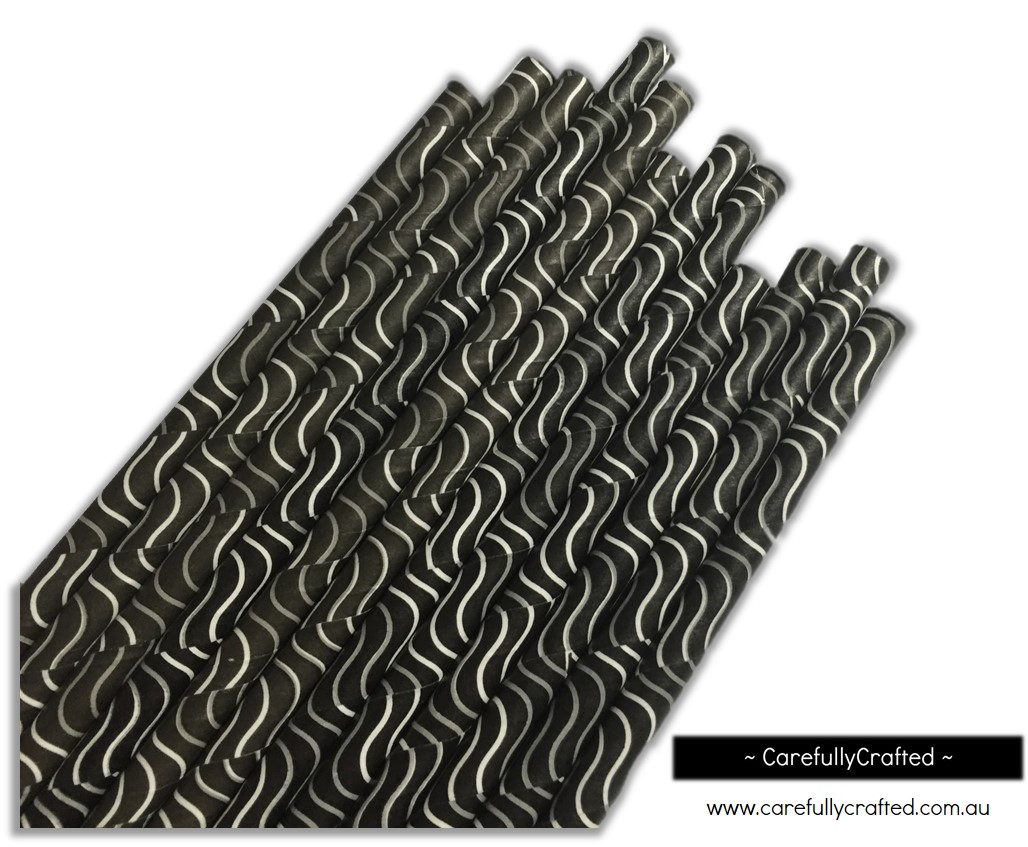 25 Paper Straws - Grey and White Swirls on Black - #PS44