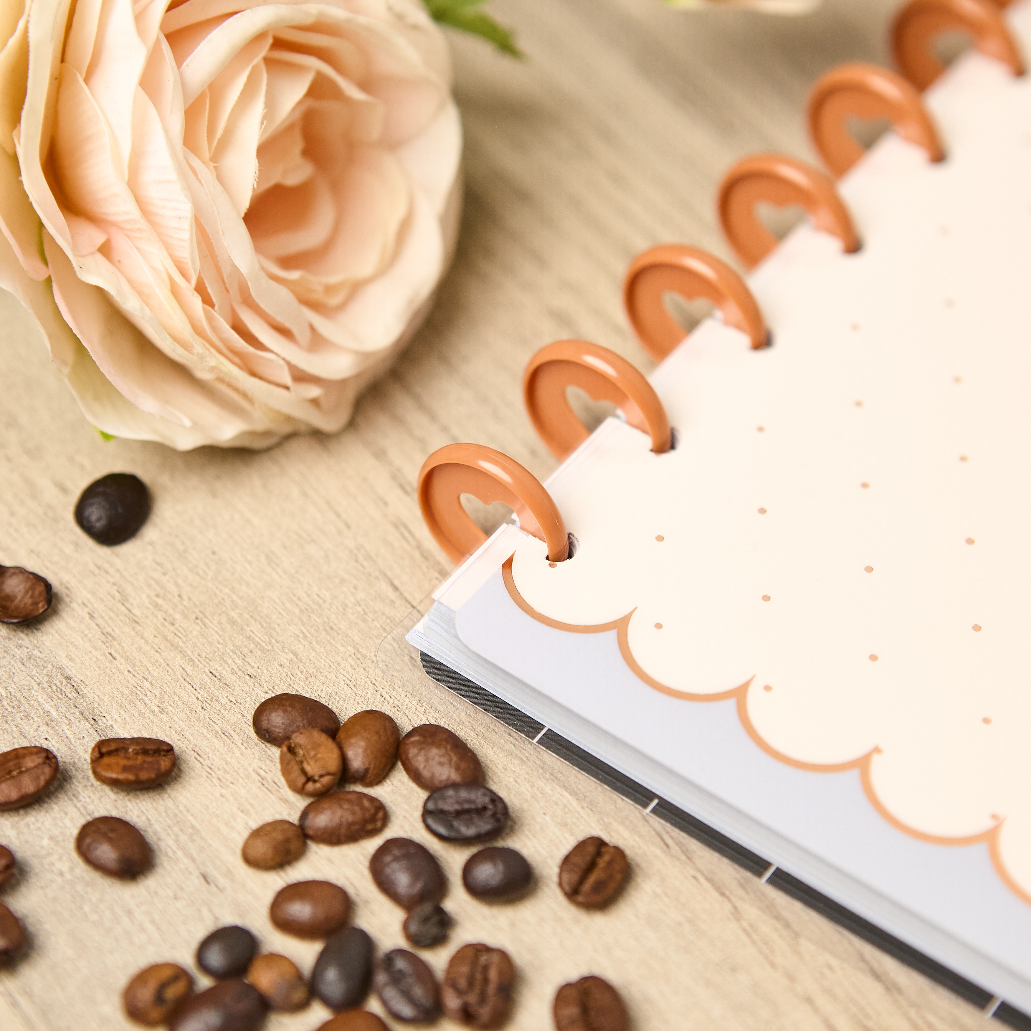 - Scalloped-edge pages accented with sweet details for a café-chic touch