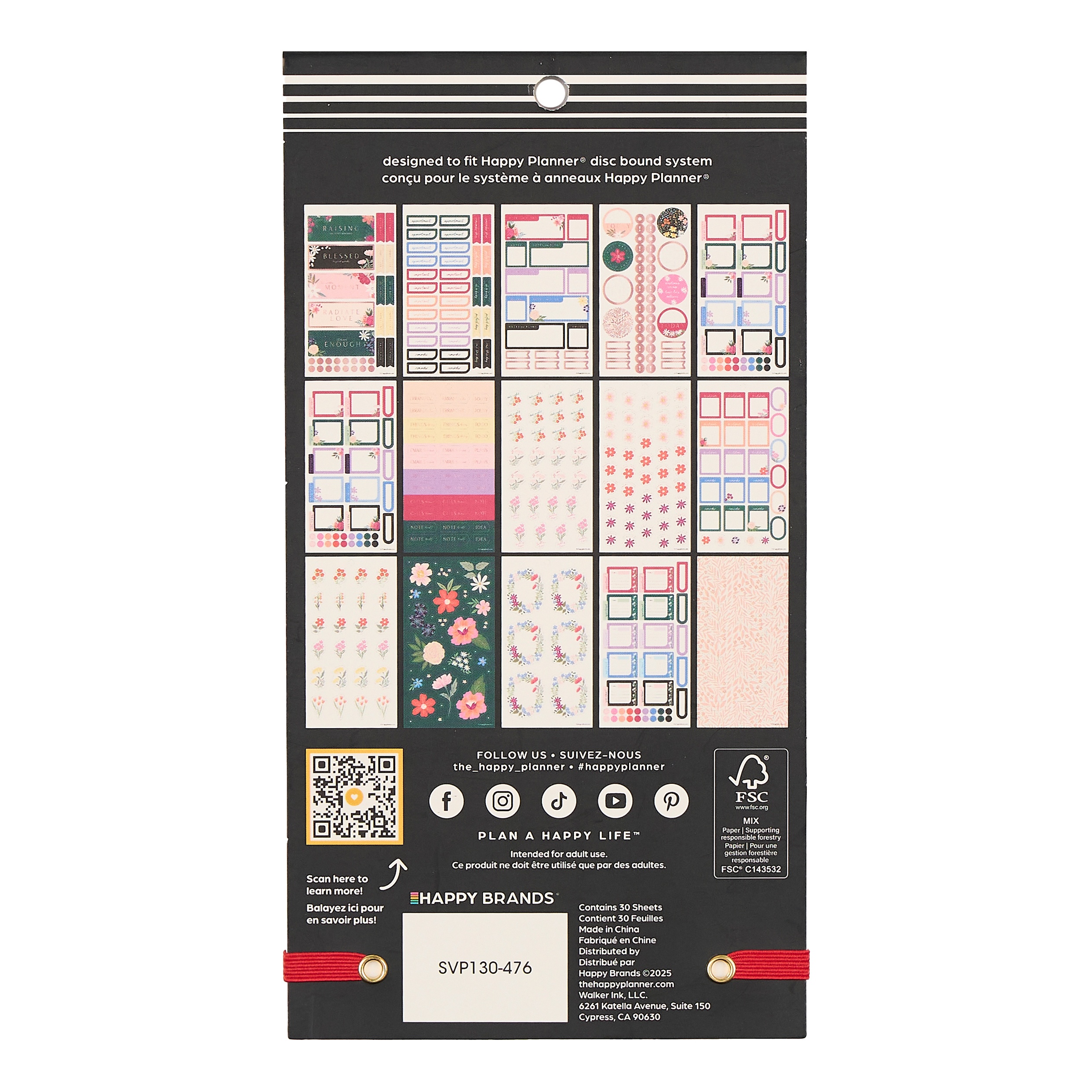 - 30 sticker sheets with a mix of functional boxes, labels, and decorative florals.