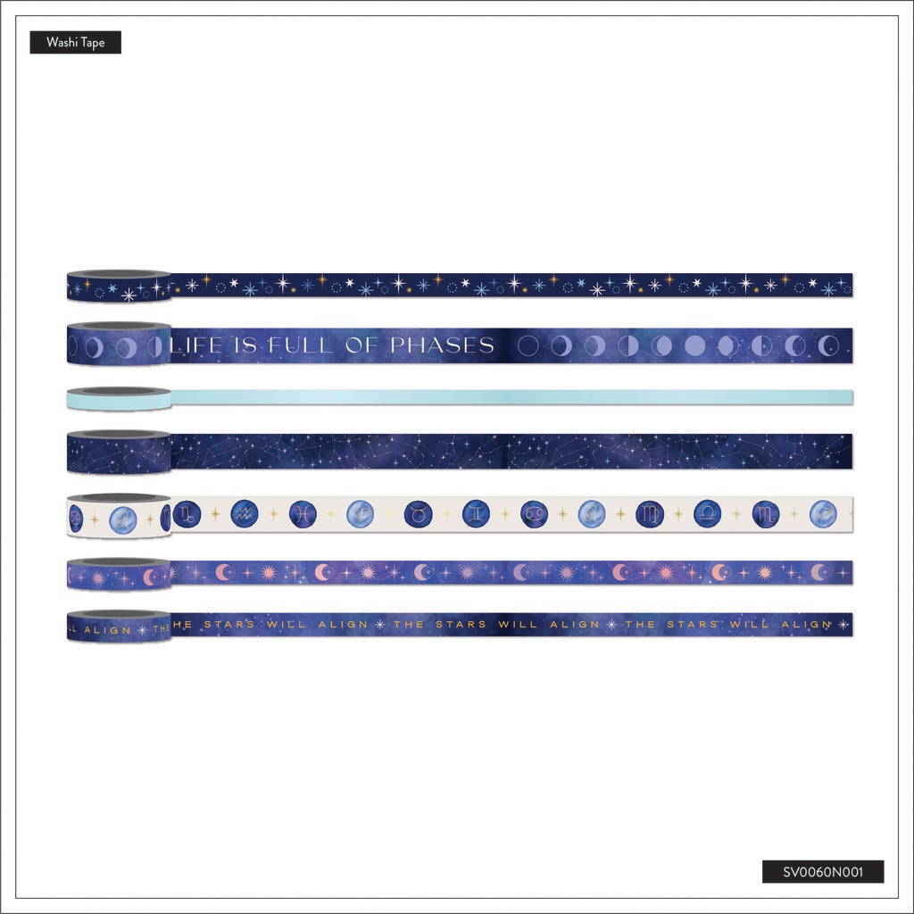 Let your plans align with the stars. This cosmic washi tape set features dreamy zodiac designs, shimmering celestial prints, and night-sky blues that add a touch of magic to every layout.